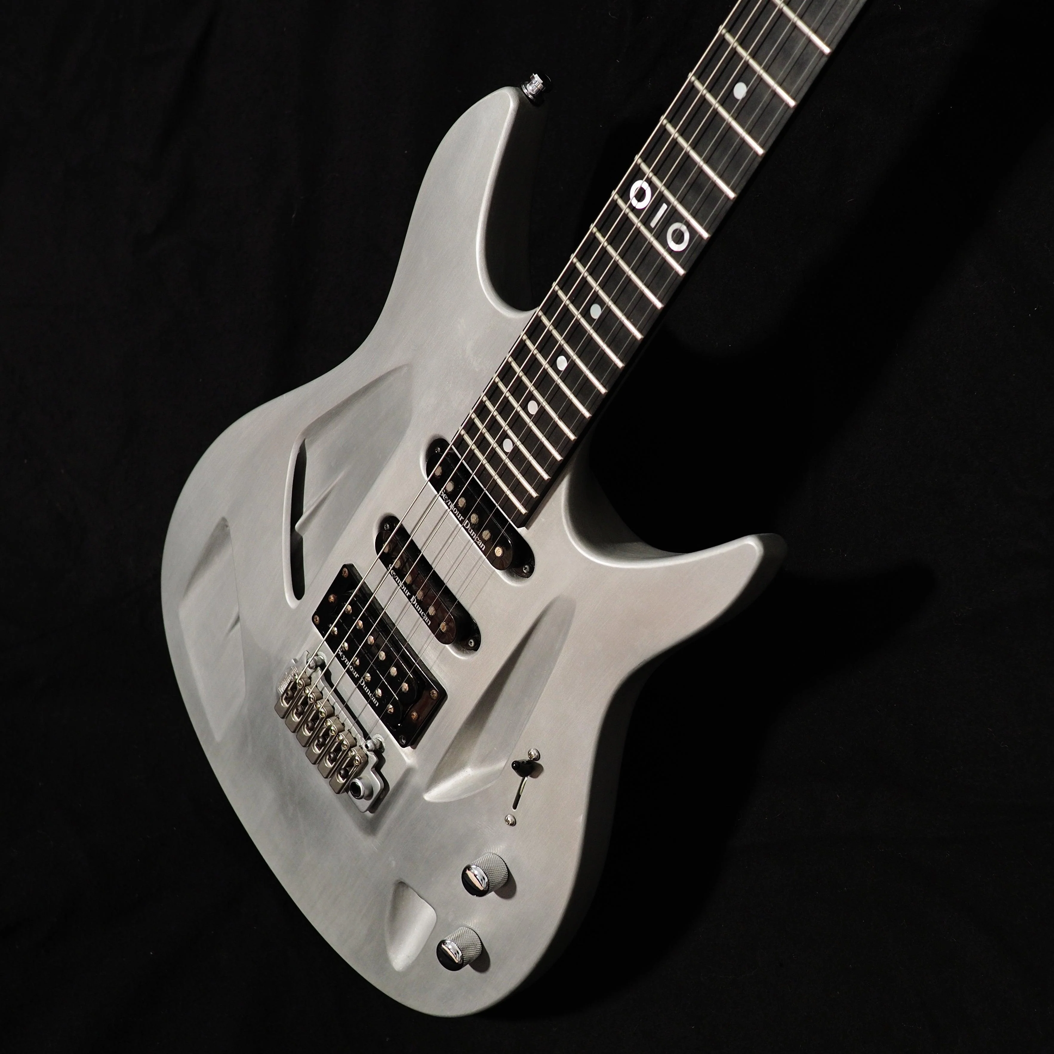 A thoroughly modern reinterpretation of the HSS-guitar-with-vibrato, this Aristides 010 (or is it OIO ?) is made from one piece of Arium, a high tech composite of different resins and glass particles designed over the course of 15 years to create the perfect tonal response. Arium does not react to outer influences like humidity, so this is a rock solid stage monster that will always have your back. With Seymour Duncan USA Pickups, a Wilkinson Trem and a premium grade ebony fretboard, you're good to go. The sprayed aluminium finish has taken on some wear and looks like it came straight from the movie Blade Runner. Nice.