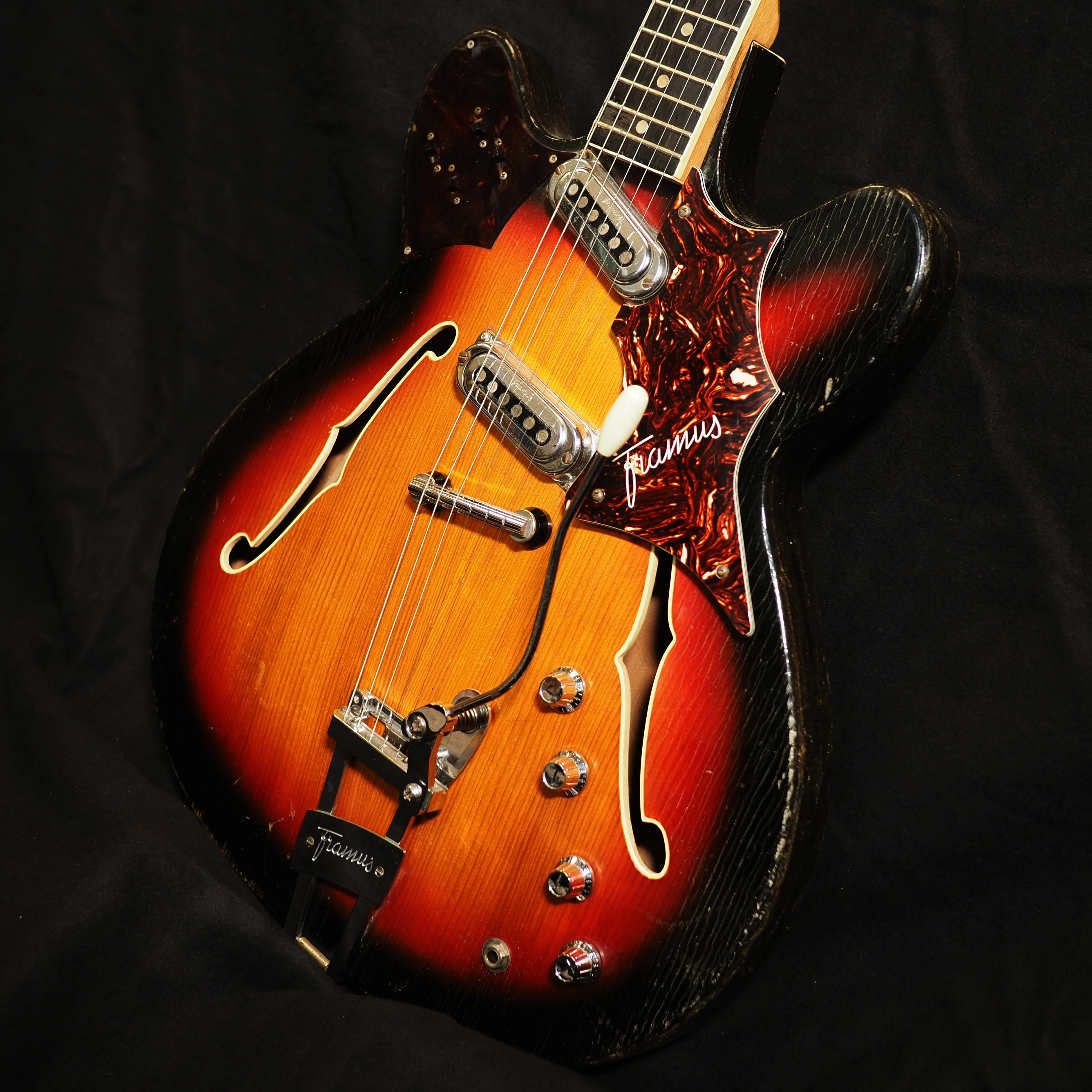 This is a cool thinline from Framus, the top of the line model in the Atlantic series. It seems to have a solid spruce top and laminated back and sides, as well as a laminated neck, and is built to a high standard. The tremolo is a joy to use, the tuners work well and the pickups have a very nice vintage sound, great for rock and roll, indie or garage rock. It's been fully set up and is ready to play.