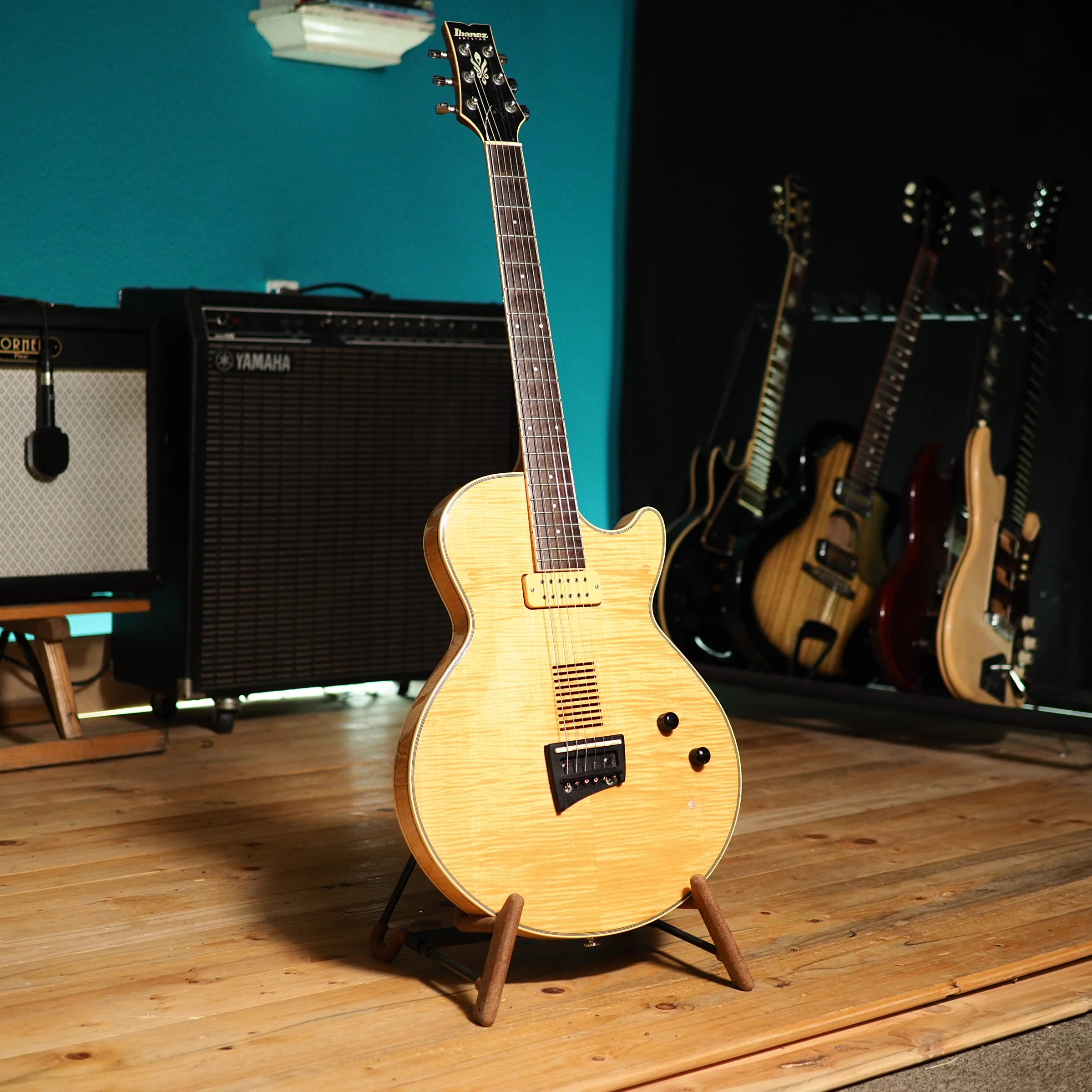 The Ibanez Artstar AE200 is a very exciting vintage Ibanez - an electro-acoustic with striking looks and a super fast neck. This made in Japan semi-hollow thinline features beautiful flamed maple and a mini humbucker, as well as a piezo system. The electric tone is nice and jazzy, with very clearly defined notes thanks to the bone bridge - it sounds like a very good solid wood big box jazz guitar, minus the feedback. The piezo system gives you acoustic tones, making this a very versatile instrument. It's joyous to play and ready to be taken on adventures.